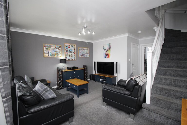 Windows and door to front with views of the Moray Firth and Black Isle beyond. Doors to cloak room, kitchen and under stairs storage cupboard housing the electrics. T.V. point. Smoke alarm. Carpet.