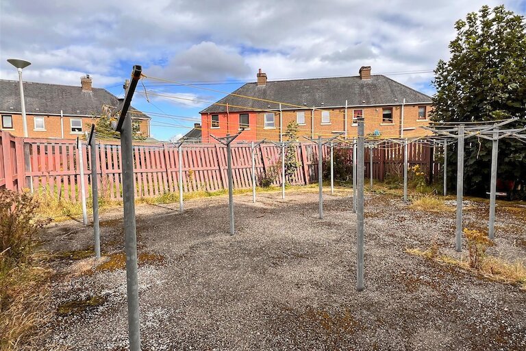The communal garden ground around the block has been laid to lawn with paving slabs. There is a common drying area.