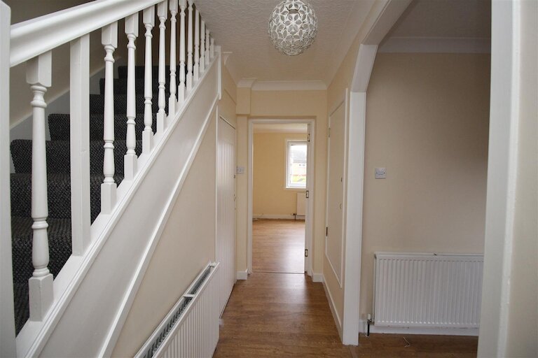 Archway to kitchen and 15 pane glazed door to lounge. Staircase to first floor. Understairs storage cupboard housing the electric meter. Storage cupboard. Smoke alarm. Laminate flooring.